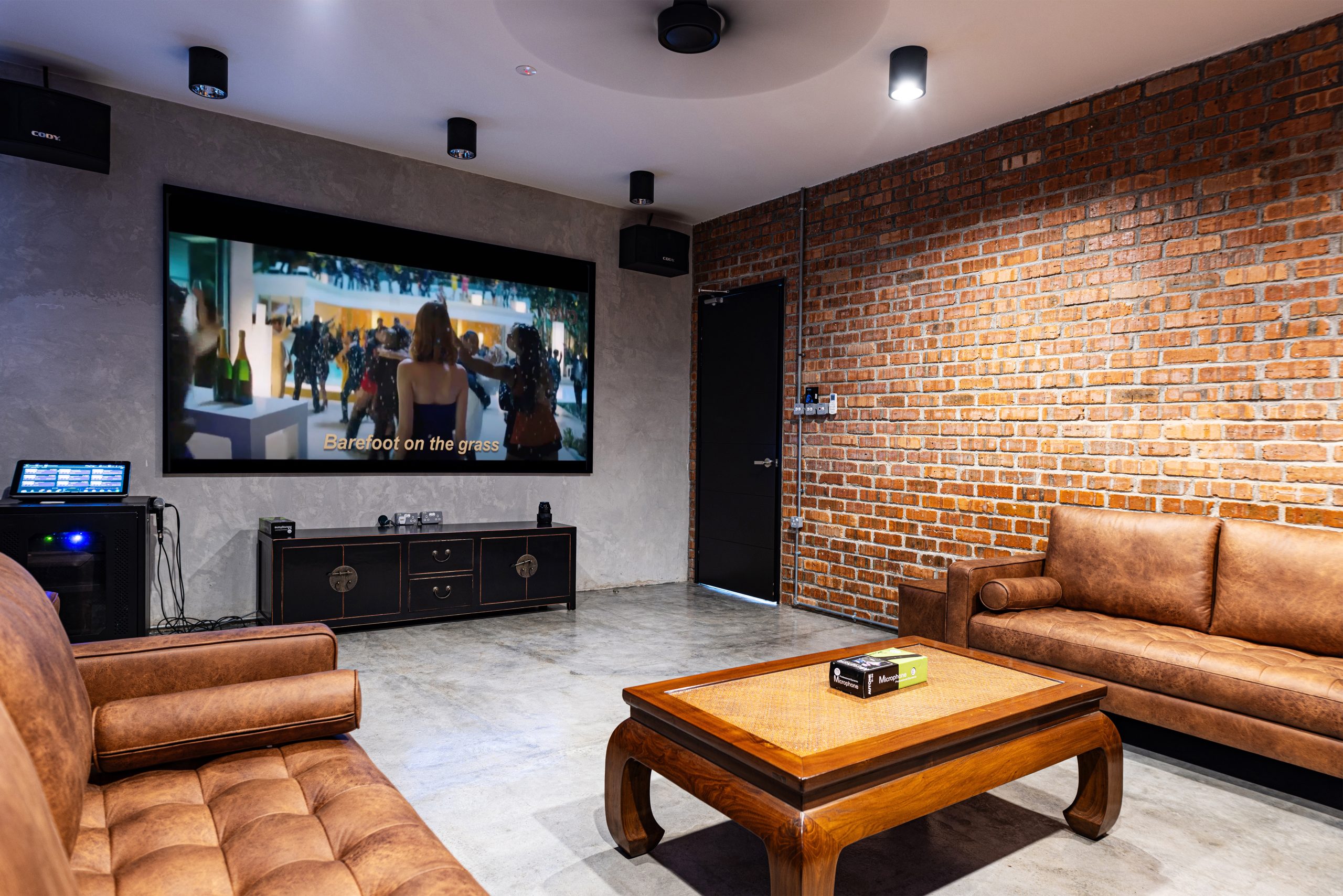 The karaoke room features a stylish industrial design with exposed brick walls and sleek concrete flooring. Comfortable leather sofas provide ample seating, while a large screen and high-quality sound system ensure an immersive karaoke experience. Modern lighting fixtures add to the ambiance, making it an ideal spot for social gatherings and entertainment. The room is equipped with all necessary technology for a seamless karaoke session, promising hours of fun and relaxation.